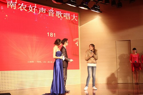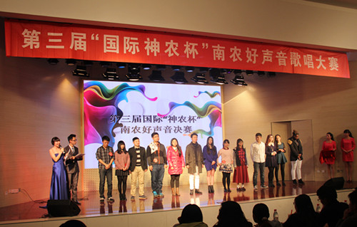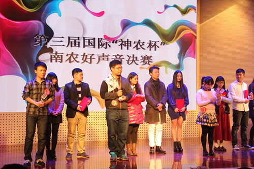 2014年12月6日晚,由南京农业大学究生会主办,加拿大28 研分会、动物医学学院研分会、公共管理学院研分会、江苏省农业科学院研分会承办的第三届国际“神农杯”南农好声音决赛在大学生活动中心举行,研究生院教育管理办公室杨海峰老师、动科院辅导员苗婧老师、校研会主席王卉和副主席徐琳以及各研分会主席、校十佳歌手大赛冠军刘惠东等出席了本届大赛。本次比赛受到了众多学生的关注,大活现场人头攒动,座无虚席。 经过初赛紧张激烈的角逐,共有来自全校各学院的13名选手脱颖而出,成功晋级决赛。决赛分为先声夺人、组合对碰、冠军争夺战三个环节。 第一环节先声夺人,支教一年回校读研的唐骥龙以一首弹唱《去大理》开始了精彩的表演。美丽的哈萨克族姑娘沙吾列一曲《美丽的姑娘》把大家带入了异域风情。外国友人简希的一曲《Make you feel my love》更是将比赛带入高潮。罗学良的一曲《向天再借五百年》更是唱出了美声的感觉,让大家震撼。多才多艺的颜如雪唱跳的《普通朋友》掀起了大家热烈的掌声。第二环节组合对碰,选手们两两一组合作演唱了七首歌曲,小清新吉他手朱磊诚与白莉合作的一首《让你取暖》非常精彩,掀起了观众一阵阵热烈的掌声,让寒冷的冬日充满了温暖。林珍妮与楚佳希两位实力唱将合作的《你不知道的事》巧妙地展示了她们不俗的唱功。冯昊与柯诗远的深情对唱《你最珍贵》将大赛又一次推向高潮。